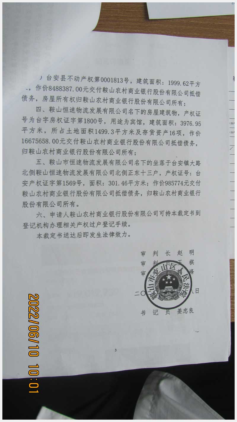 名稱:臺安鎮臺大路北側鞍山恒速物流發展有限公司北側正房東十三戶房產 面積:301.46㎡ 瀏覽次數:926